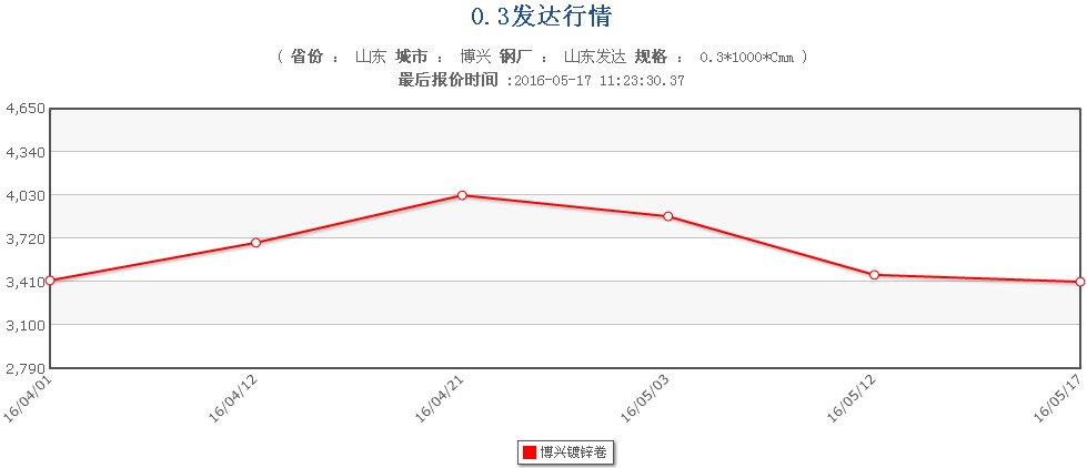 以山东地区博兴市场发达钢厂,镀锌卷0.3*1250*Cmm为例,图1为四月开始至今本地镀锌卷价格走势图,可以清楚的看到该品种价格紧跟钢坯调价,先涨后跌,整体呈现一个过山车式的价格行情。由4月21号的最高点4020元/吨下行至现在的3440元/吨,深跌幅度580。
